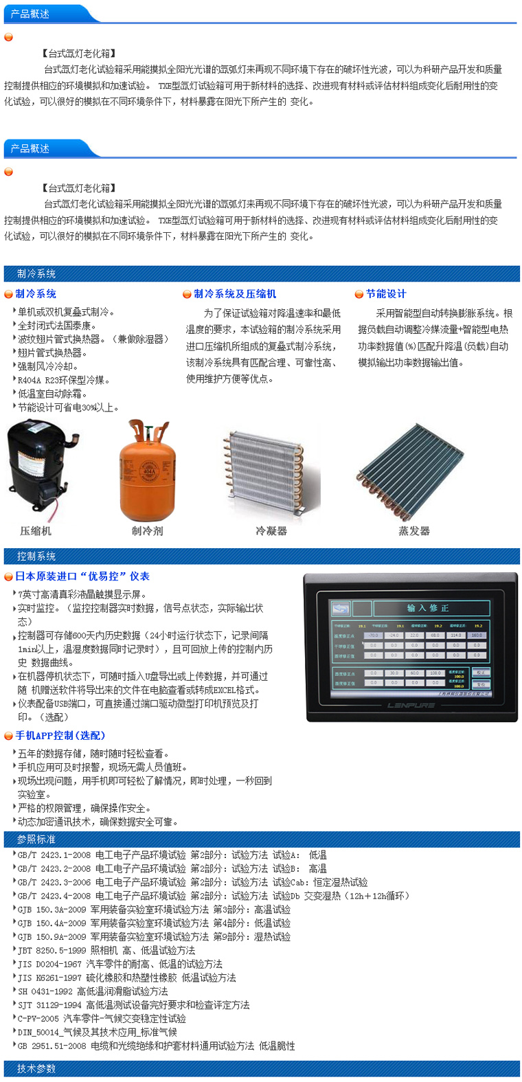 該設備符合國家標準:GB12831-86硫化橡膠人工氣候(氙燈)老化試驗方法,GB/T1644.2-1999塑料試驗室光源暴露實驗法(第二部分:弧氙燈),GB/T8427-89紡織品 色牢度試驗 耐人造光色牢度氙弧,GB/T8430-98紡織品色牢度試驗 耐人造光色牢度氙弧,GB/T1865-97色漆 清漆 人工氣候老化和人工輻射暴露(濾過的氙弧弧射),GB/T16991-97紡織品色牢度試驗 高溫耐光色牢度(氙燈),